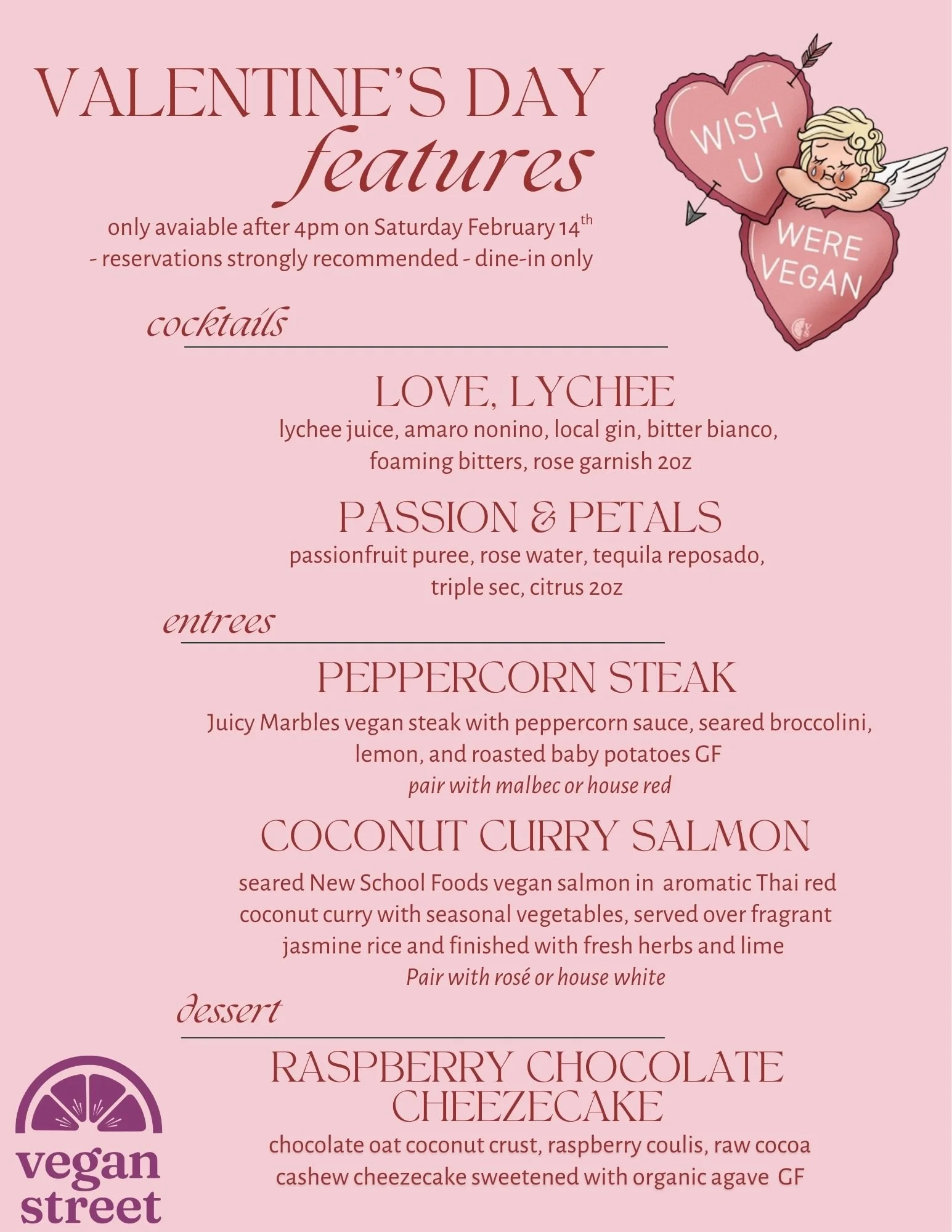 Join us for an evening of romance with our exclusive Valentine’s Day menu, including vegan steak and salmon dinners