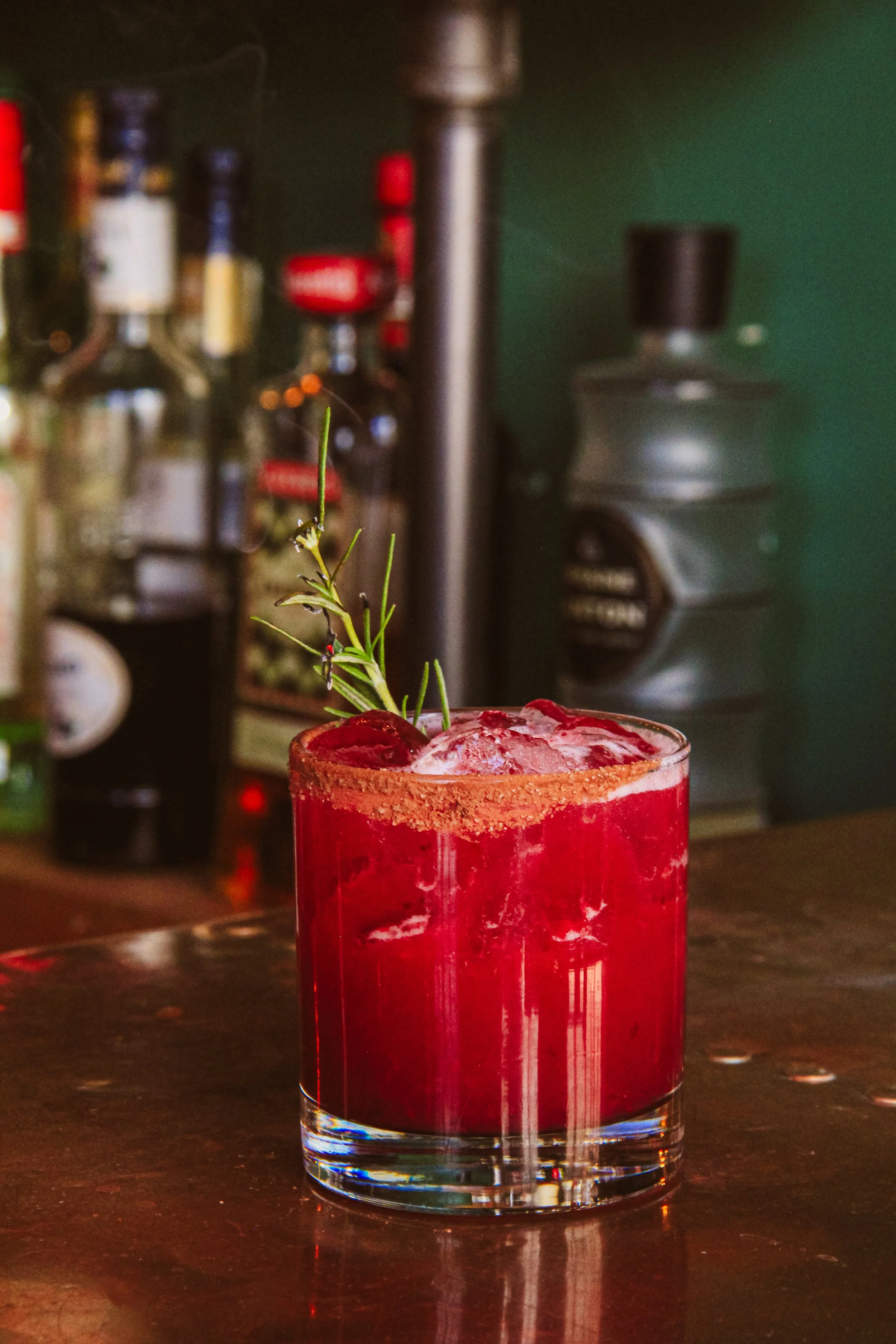 Smokey Cran-Mary with cranberry puree, rosemary syrup, citrus, mezcal, triple sec, cinnamon rim
