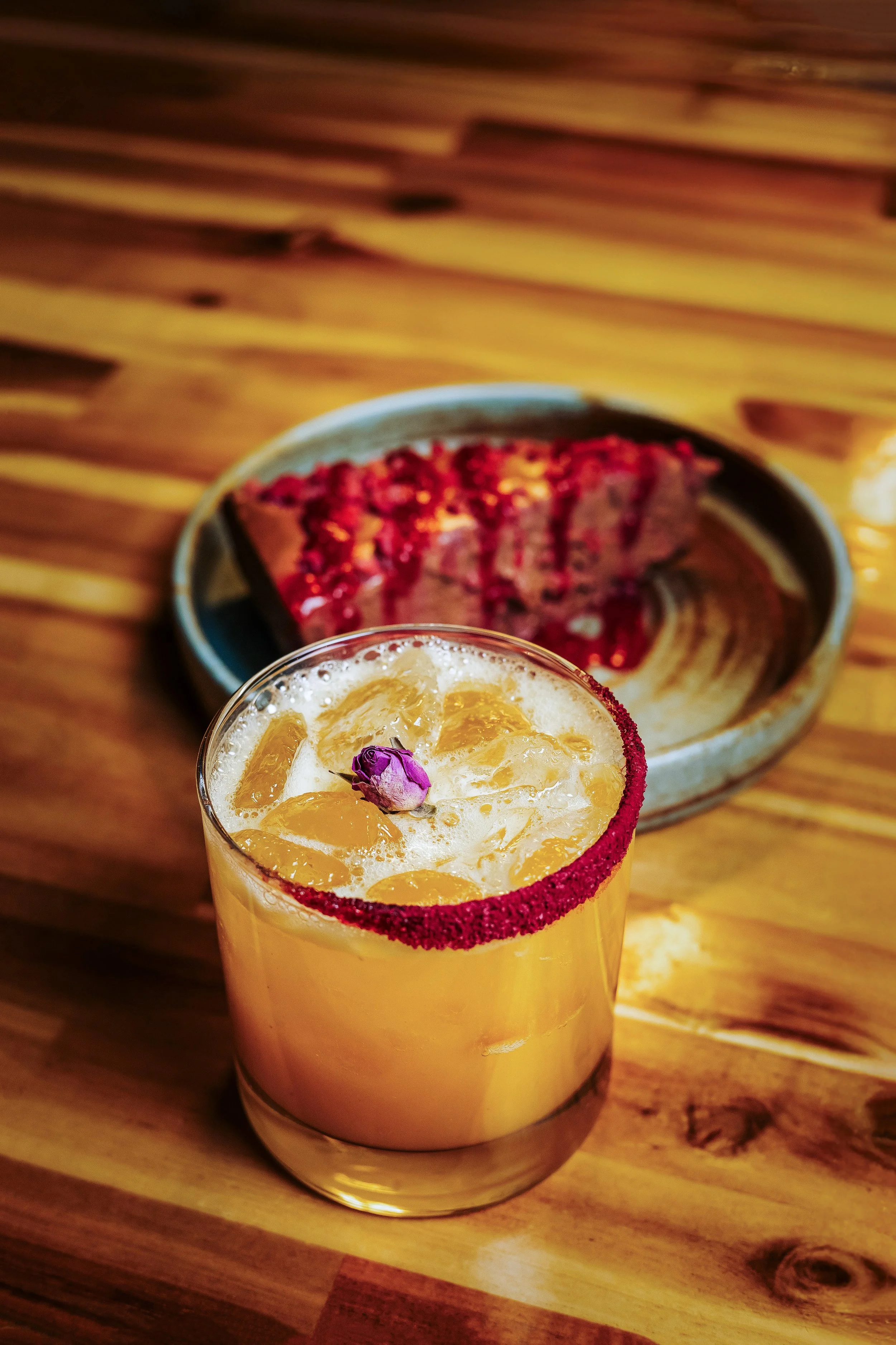 Passion & Petals with reposado tequila, triple sec, passionfruit puree, rose water, citrus, and beet sugar rim